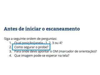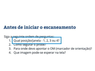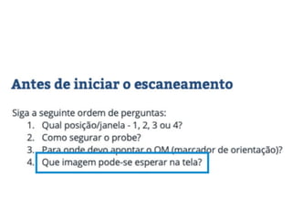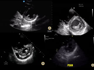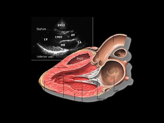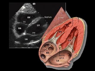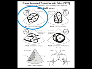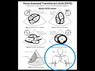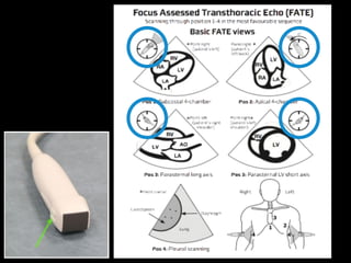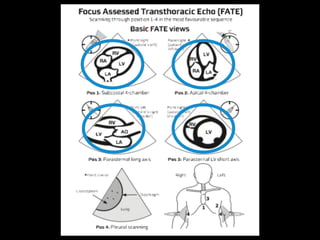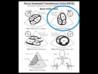O documento descreve a ecocardiografia focada (FATE), um exame ultrassonográfico do coração simples e rápido que fornece respostas binárias sobre possíveis condições cardíacas de alto risco como infarto ou tamponamento. O exame pode ser realizado com equipamentos básicos e é útil para tomada de decisões perioperatórias. Ele envolve visualização das câmaras cardíacas, função ventricular e pleuras para diagnosticar ou descartar urgências cardíacas.