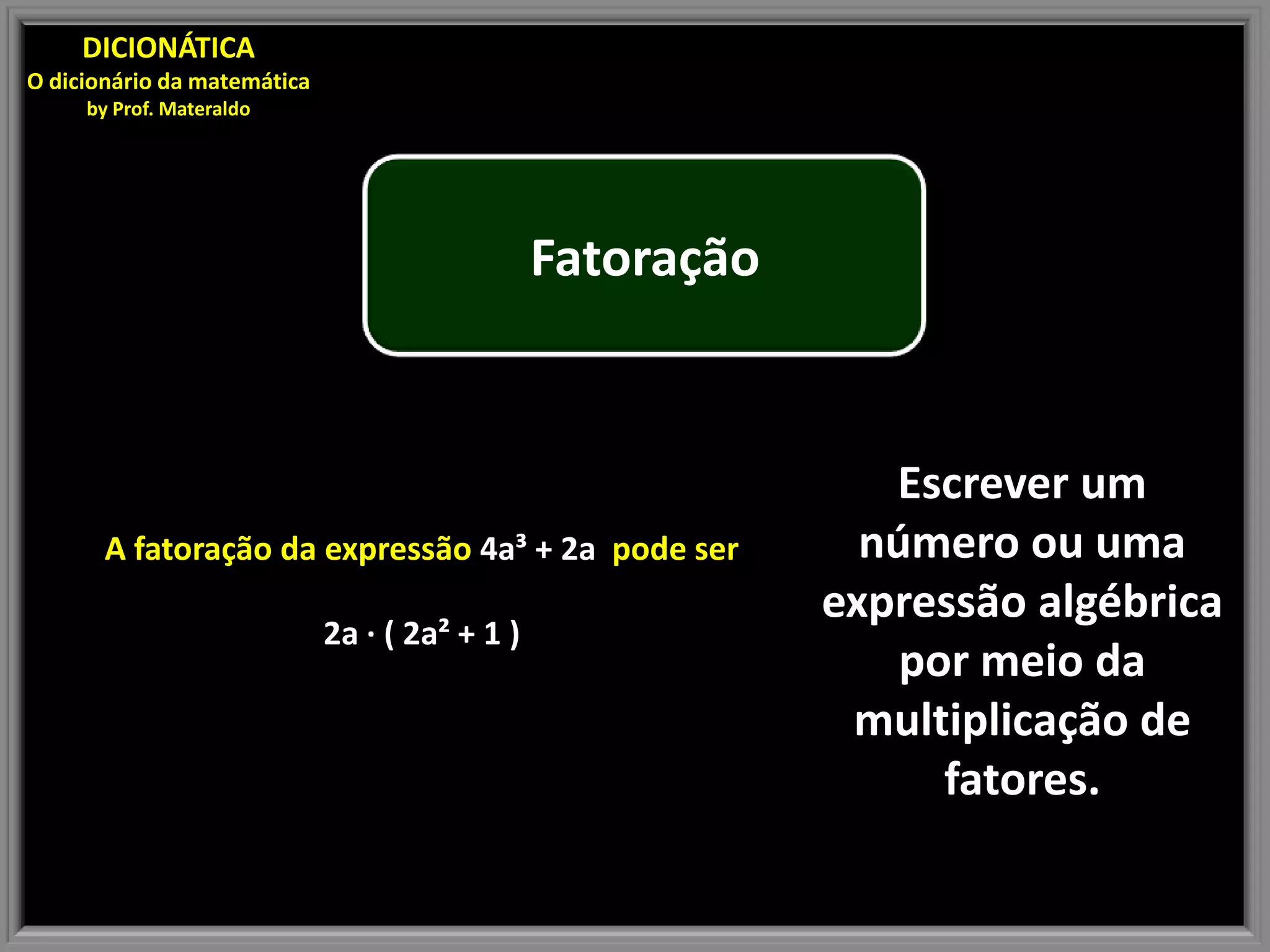 A fatoração da expressão 4a3 + 2a pode ser representada como 2a · (2a2 + 1), que é escrita como a multiplicação de fatores.