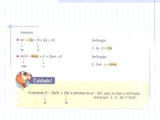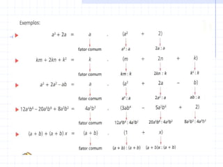 O documento descreve produtos notáveis e fatoração de expressões algébricas. Ele lista produtos notáveis como o quadrado de uma soma ou diferença e o cubo de uma soma ou diferença. Também explica como fatorar expressões com um fator comum, por agrupamento, diferença de dois quadrados e trinômio do quadrado perfeito.