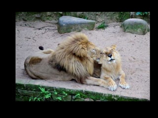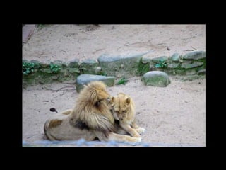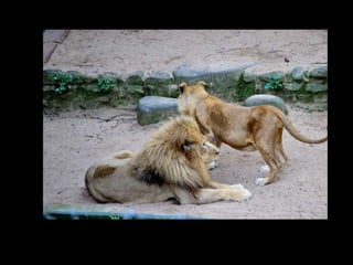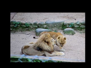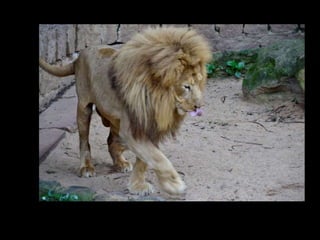 O documento descreve as características principais do leão, incluindo seu comprimento, peso, cor e altura. O leão é encontrado principalmente na África, mas também na Ásia e Europa. Suas principais características são um comprimento entre 2,5-3 metros para machos e 2,3-2,7 metros para fêmeas, peso entre 150-230 kg para machos e 120-170 kg para fêmeas, e cor variando do amarelo claro ao marrom.