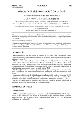 Este estudo inventariou a avifauna do município de São Sepé no Rio Grande do Sul, Brasil. Foram registradas 217 espécies pertencentes a 58 famílias entre 2008-2012. Algumas espécies ameaçadas foram encontradas, incluindo Cairina moschata, Amazona pretrei e Crypturellus noctivagus.