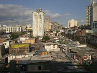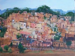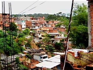 O documento explora a realidade das favelas através da música 'Ave Maria no Morro', refletindo sobre a vida nas comunidades e contrastando com a imagem do Bope e a cultura popular. A letra evoca a espiritualidade e as dificuldades enfrentadas pelos moradores, sugerindo um sentimento de esperança apesar das adversidades. A apresentação é finalizada com uma citação de Renato Cardoso e imagens ilustrativas que complementam a mensagem.