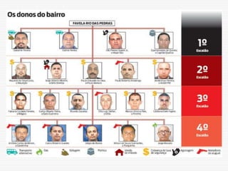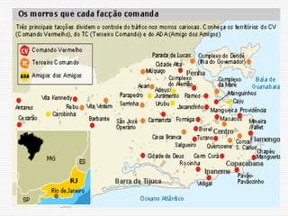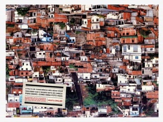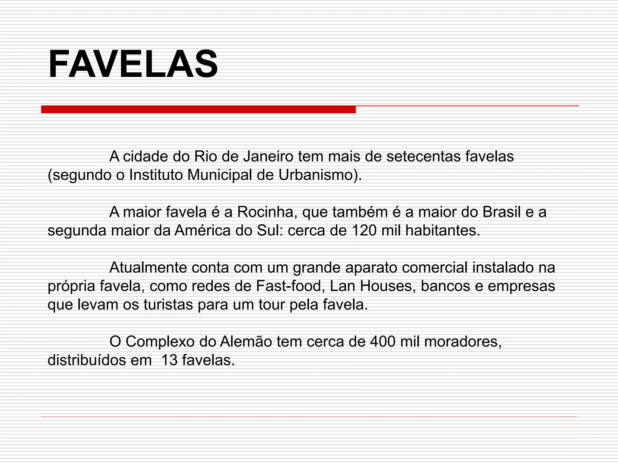O Rio de Janeiro possui mais de 700 favelas, destacando-se a Rocinha como a maior do Brasil e a segunda da América do Sul, com uma população de cerca de 120 mil habitantes. Apesar da existência de uma extensa rede de escolas públicas, a evasão escolar dos jovens é alta devido à falta de interesse e à sedução do tráfico de drogas, que oferece uma alternativa econômica atraente. A situação é complexa, com a presença de milícias corruptas causando desafios adicionais à segurança e desenvolvimento das comunidades.