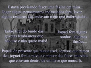 O documento descreve a faxina que a pessoa fez em si mesma, jogando fora pensamentos negativos como raiva e mágoas, e guardando coisas positivas como amor, esperança e boas lembranças para se concentrar no futuro.