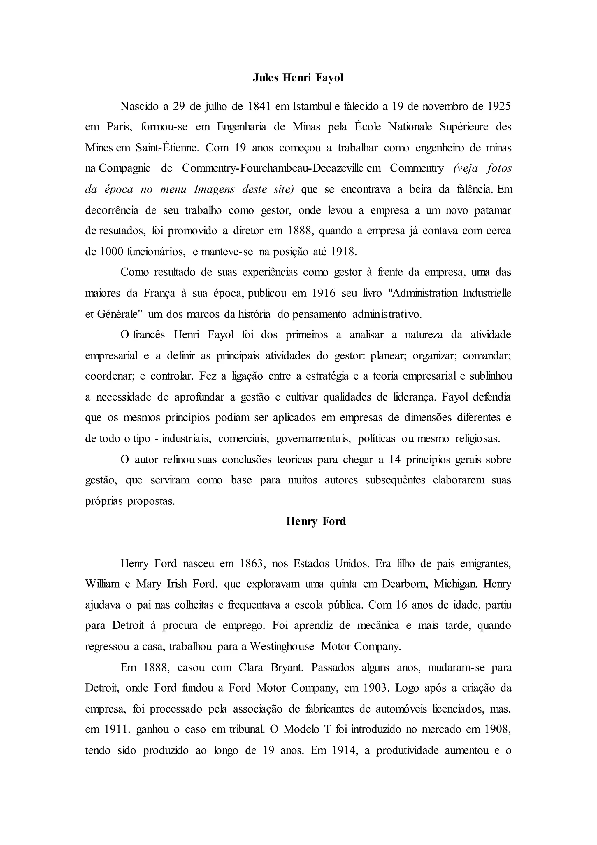 Jules Henri Fayol foi um engenheiro de minas e gestor francês que revitalizou uma empresa mineira à beira da falência e publicou um livro seminal sobre gestão em 1916 que definiu as principais atividades de um gestor como planear, organizar, comandar, coordenar e controlar. Henry Ford foi um empresário norte-americano que fundou a Ford Motor Company em 1903 e revolucionou a indústria automóvel com a produção em massa do Modelo T a partir de 1908.