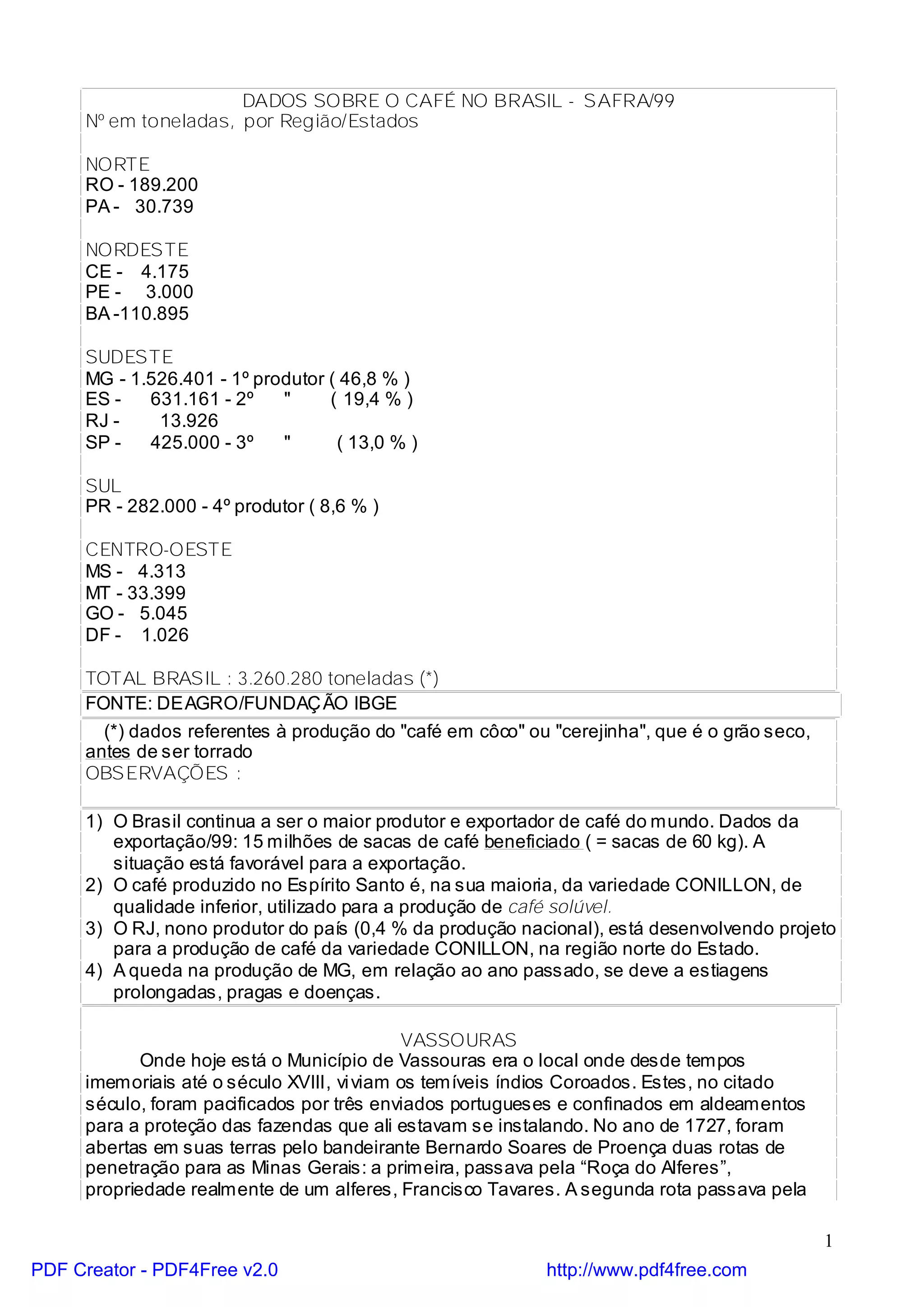 O documento fornece informações sobre a produção de café no Brasil em 1999, destacando que Minas Gerais foi o maior produtor, responsável por quase metade da produção nacional, seguido pelo Espírito Santo. Também resume a história da cidade de Vassouras no Rio de Janeiro, desde sua fundação até se tornar um importante centro produtor de café no século XIX.
