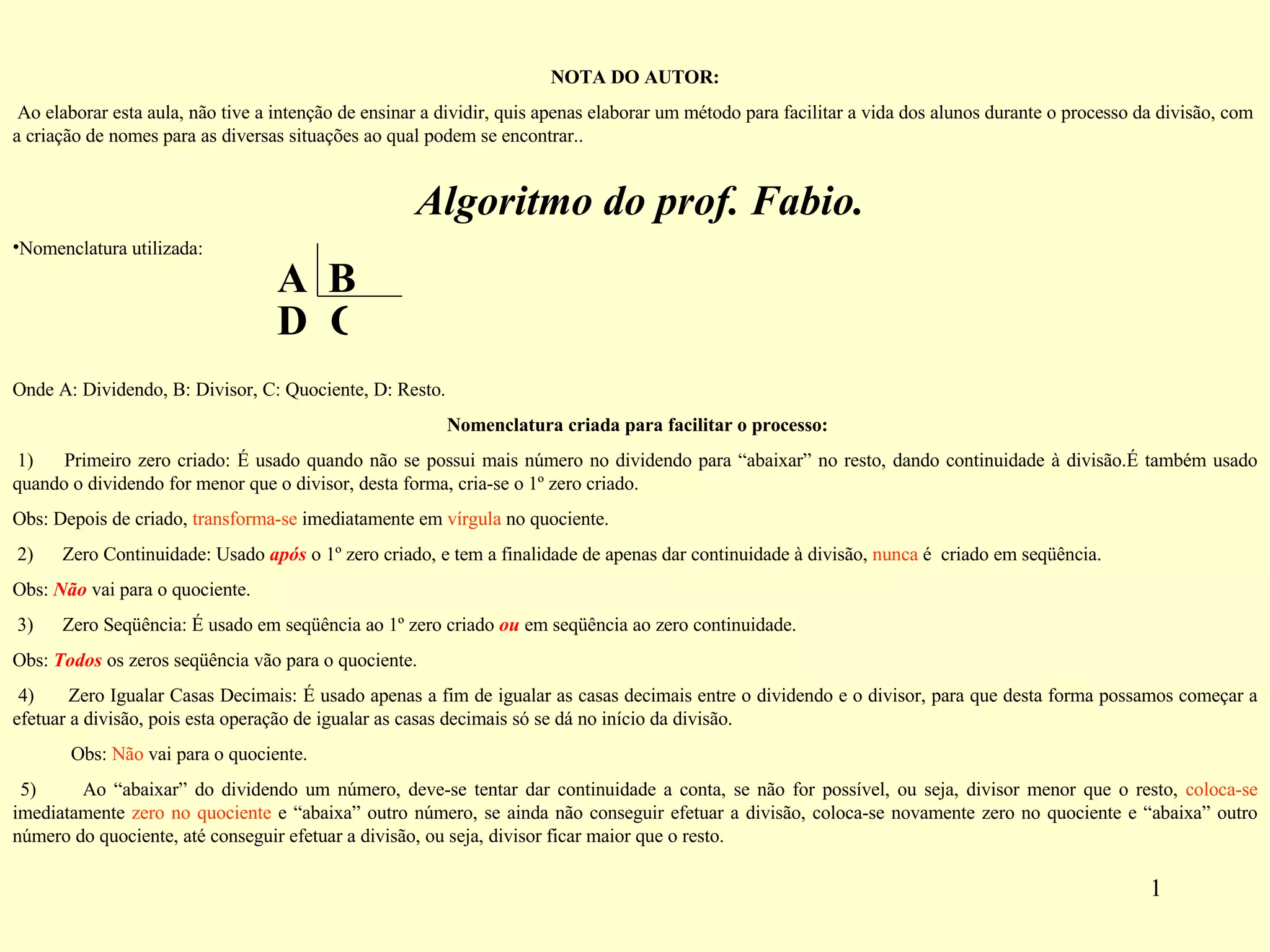 NOTA DO AUTOR: Ao elaborar esta aula, não tive a intenção de ensinar a dividir, quis apenas elaborar um método para facilitar a vida dos alunos durante o processo da divisão, com a criação de nomes para as diversas situações ao qual podem se encontrar.. Algoritmo do prof. Fabio. Nomenclatura utilizada: Onde A: Dividendo, B: Divisor, C: Quociente, D: Resto. Nomenclatura criada para facilitar o processo: 1) Primeiro zero criado: É usado quando não se possui mais número no dividendo para “abaixar” no resto, dando continuidade à divisão.É também usado quando o dividendo for menor que o divisor, desta forma, cria-se o 1º zero criado. Obs: Depois de criado, transforma-se imediatamente em vírgula no quociente. 2) Zero Continuidade: Usado após o 1º zero criado, e tem a finalidade de apenas dar continuidade à divisão, nunca é criado em seqüência. Obs: Não vai para o quociente . 3) Zero Seqüência: É usado em seqüência ao 1º zero criado ou em seqüência ao zero continuidade. Obs: Todos os zeros seqüência vão para o quociente. 4) Zero Igualar Casas Decimais: É usado apenas a fim de igualar as casas decimais entre o dividendo e o divisor, para que desta forma possamos começar a efetuar a divisão, pois esta operação de igualar as casas decimais só se dá no início da divisão. Obs: Não vai para o quociente. 5) Ao “abaixar” do dividendo um número, deve-se tentar dar continuidade a conta, se não for possível, ou seja, divisor menor que o resto, coloca-se imediatamente zero no quociente e “abaixa” outro número, se ainda não conseguir efetuar a divisão, coloca-se novamente zero no quociente e “abaixa” outro número do quociente, até conseguir efetuar a divisão, ou seja, divisor ficar maior que o resto. A B C D