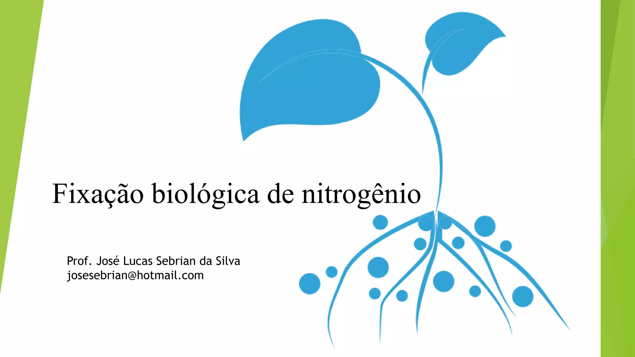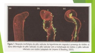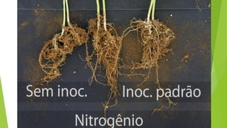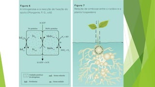 O documento discute a fixação biológica de nitrogênio por bactérias do solo chamadas rizóbios que formam nódulos nas raízes de leguminosas. A enzima nitrogenase é responsável por fixar o nitrogênio atmosférico e converter em amônia dentro dos nódulos para nutrir a planta em troca de carboidratos das leguminosas. O processo representa uma alternativa sustentável à adubação nitrogenada mineral e economiza bilhões por ano.