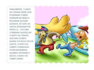 O texto descreve uma fábula sobre um rato da cidade que visita seu amigo rato do campo. Os ratos estão cavando a terra à procura de comida quando o rato da cidade comenta algo, possivelmente sobre a diferença entre a vida na cidade e no campo.