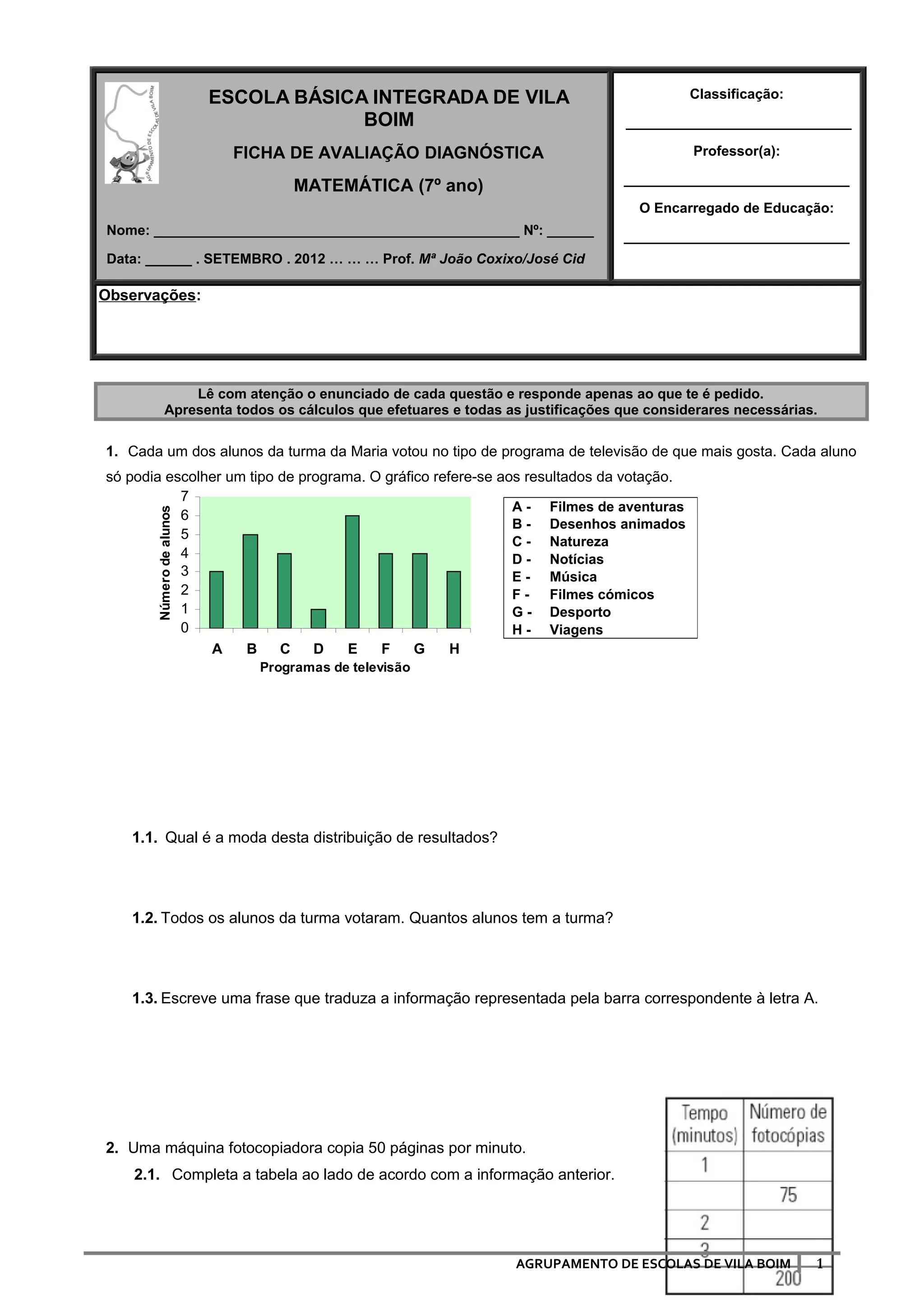 Este documento contém 15 questões de avaliação diagnóstica de matemática para alunos do 7o ano. As questões abordam tópicos como leitura e interpretação de gráficos, cálculo de velocidades, reconhecimento de padrões geométricos, cálculo de idades, operações com números racionais e inteiros, e resolução de problemas com áreas e volumes.