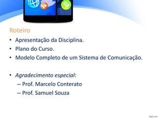 O documento apresenta um roteiro para a disciplina de Redes de Computadores, abordando conceitos fundamentais e aplicações, como o modelo de camadas OSI e a pilha de protocolos TCP/IP. Inclui informações sobre estratégias de ensino, avaliação dos alunos, e datas importantes para provas e trabalhos. Além disso, discute características de sistemas de comunicação, transmissão de dados e problemas em redes, visando desenvolver habilidades práticas e teóricas na área.