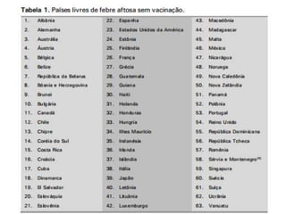 A febre aftosa é uma doença altamente contagiosa e aguda, causada por um vírus da família Picornaviridae, que afeta principalmente bovinos, suínos, ovinos e caprinos. Seu controle é crítico devido aos grandes prejuízos econômicos no mercado internacional de animais e subprodutos, e a sua transmissão ocorre de várias maneiras, incluindo contato direto e veículos contaminados. A prevenção se dá através da vacinação e medidas rigorosas de controle, essenciais na erradicação da doença.