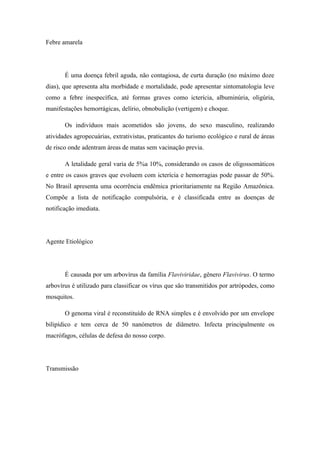 A febre amarela é uma doença viral aguda transmitida por mosquitos, com alta letalidade, especialmente em áreas endêmicas como a Amazônia brasileira. Os sintomas variam desde febres leves até formas graves com icterícia e hemorragias, com um período de incubação de três a seis dias. A imunização é fundamental na prevenção, e a vacinação deve ser realizada a partir dos nove meses de idade, com reforços a cada dez anos.
