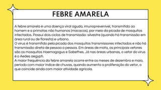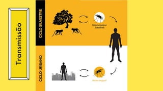 A febre amarela é uma doença viral aguda transmitida pela picada de mosquitos infectados, possuindo dois ciclos de transmissão: silvestre e urbano. Os sintomas incluem febre alta, dor de cabeça, dores musculares e no fígado, podendo levar à morte em 20-50% dos casos graves. A melhor forma de prevenção é a vacinação.