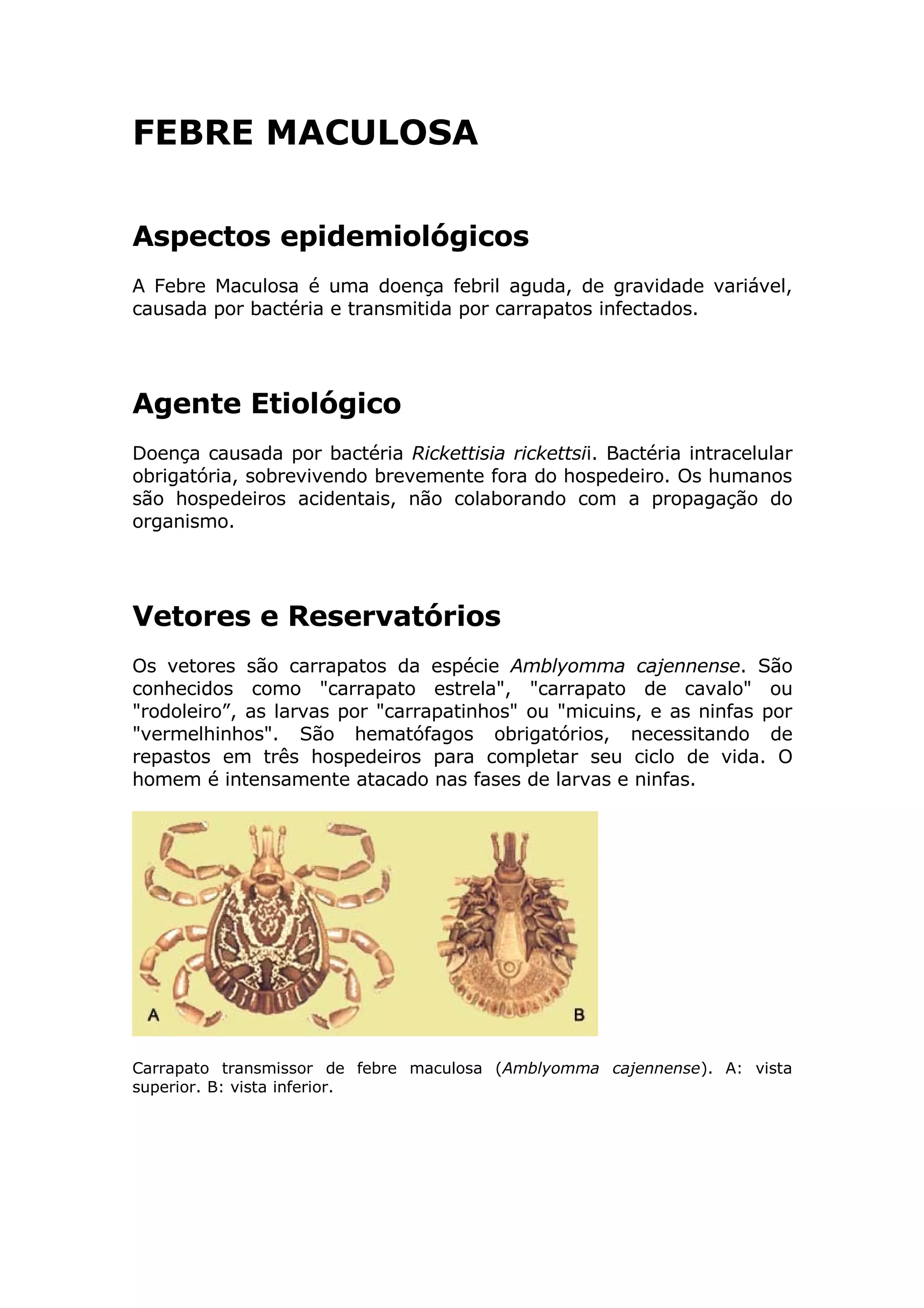 A Febre Maculosa é uma doença febril aguda transmitida por carrapatos infectados com a bactéria Rickettsia rickettsii. Os sintomas incluem febre, dor de cabeça e exantema maculopapular. O tratamento envolve o uso de antimicrobianos como cloranfenicol ou tetraciclinas associados a cuidados médicos. A prevenção inclui evitar áreas com carrapatos e removê-los corretamente caso sejam encontrados.