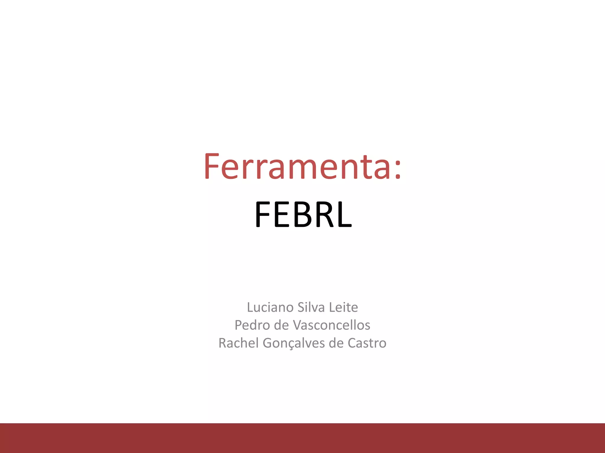 O documento descreve a ferramenta FEBRL, um sistema de código aberto para limpeza, deduplicação e vinculação de registros desenvolvido na Austrália. Apresenta as funcionalidades, demonstração, pontos positivos e negativos do FEBRL.