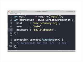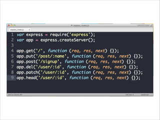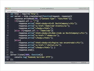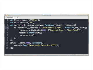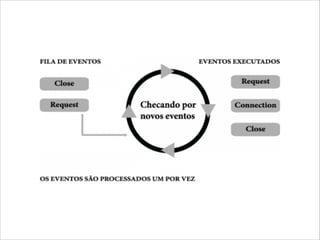 O documento discute Node.js, uma plataforma baseada no JavaScript que permite a criação de aplicações de rede escaláveis e de alto desempenho. Node.js usa um modelo de E/S não-bloqueante e de eventos que o torna leve e eficiente para aplicações em tempo real distribuídas. O documento também explica como Node.js resolve problemas de escalabilidade e desempenho em tempo real usando E/S não-bloqueante e loop de eventos em uma única thread.