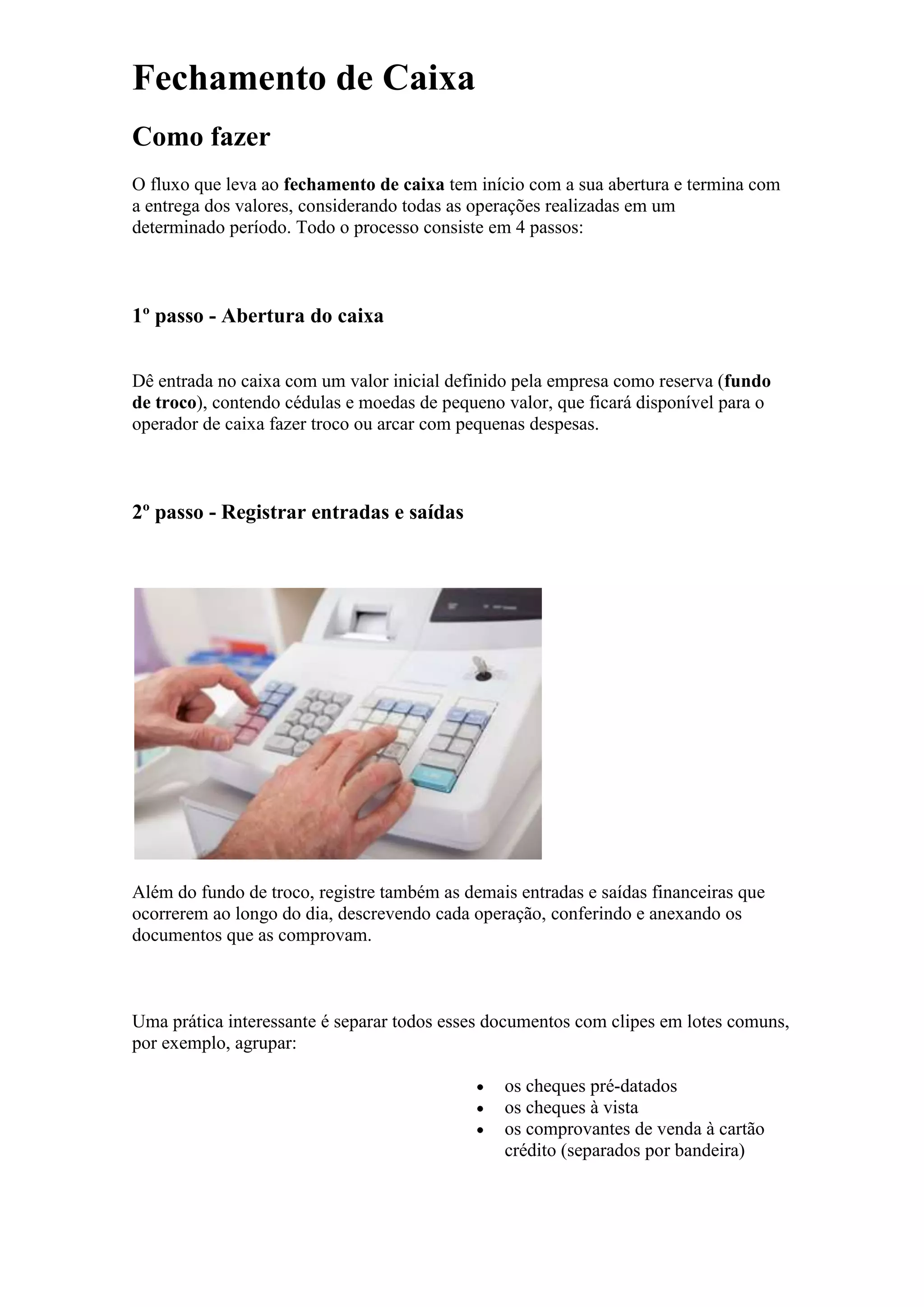 O documento descreve o processo de fechamento de caixa em 4 etapas: 1) abertura do caixa com valor inicial, 2) registro de entradas e saídas, 3) conferência dos valores no caixa, 4) finalização do fechamento comparando os valores registrados com os valores reais no caixa. Também recomenda formas de execução do fechamento de caixa de acordo com o volume de movimentações e necessidade de controle da empresa.