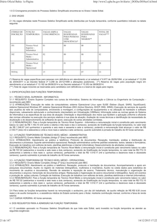 O documento trata de um edital de abertura de inscrições para processo seletivo simplificado na Fundação Pedro Calmon para contratação temporária de pessoal. O edital especifica 23 vagas distribuídas entre três funções temporárias, requisitos, atribuições e remuneração para cada função, cronograma do processo seletivo e requisitos para admissão.