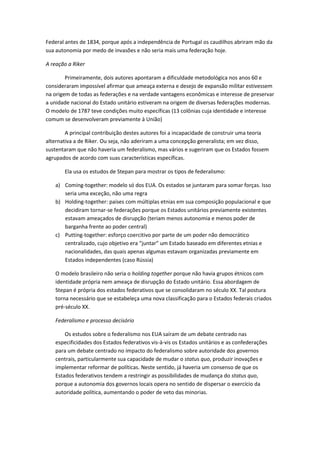 [1] O documento discute a visão do cientista político norte-americano Riker sobre o federalismo no Brasil, que Arretche contrapõe com evidências históricas. [2] Posteriormente, analisa como estudos posteriores criticaram a abordagem de Riker por usar apenas o modelo dos EUA como referência, sugerindo que há diferentes tipos de federalismo. [3] Por fim, discute como as pesquisas sobre federalismo evoluíram para analisar seu impacto sobre processos decisórios e políticas públicas.