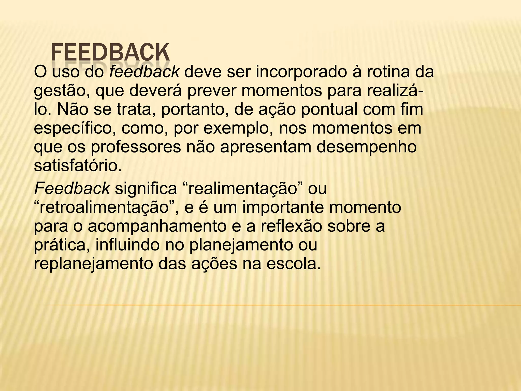 O documento discute a importância do feedback na gestão escolar, definindo-o como um momento de acompanhamento e reflexão sobre a prática docente que influencia o planejamento das ações na escola. O feedback promove o diálogo entre os professores, questionamentos e novas sugestões para a prática. O documento fornece também diretrizes para a realização de reuniões de feedback, como a criação de um ambiente de confiança e o uso de perguntas descritivas e esclarecedoras.