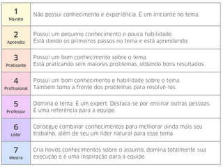 O documento discute vários métodos e ferramentas para fornecer feedback, incluindo avaliações individuais, coletivas e NxN; feedback anônimo; competências técnicas e comportamentais; e softwares como Webgoal e 7geese. Também fornece dicas para criar oportunidades de feedback e recompensar comportamentos desejados.