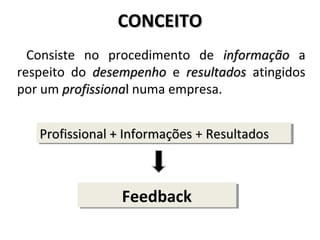 O documento discute como dar feedback de forma correta, definindo o conceito de feedback como a informação sobre o desempenho e resultados de um profissional. Explora os tipos de feedback como positivo, corretivo e negativo, e fatores como preparação, escolha do local e ouvir ativamente para dar feedback de maneira construtiva.