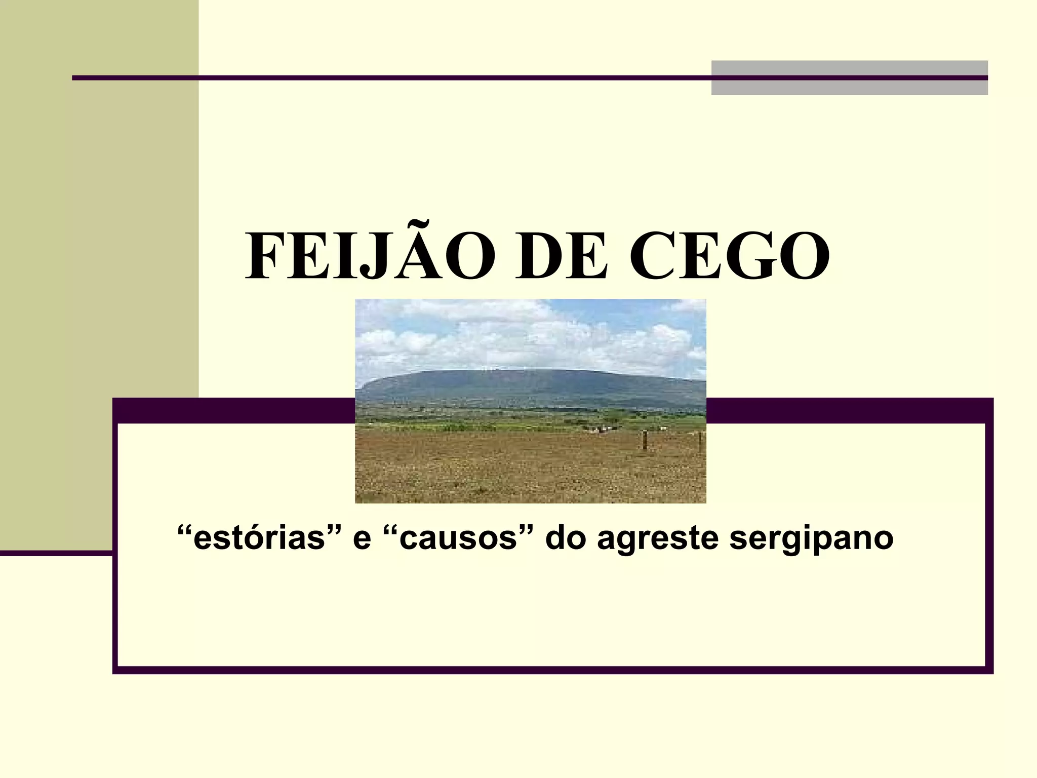 O documento apresenta um resumo dos aspectos estruturais e temáticos dos contos presentes no livro "Feijão de Cego", do autor Vladimir Souza Carvalho. Os contos retratam a sociedade rural e patriarcal do agreste sergipano, com temáticas como violência, traição e opresão da mulher. A linguagem utilizada mistura elementos regionais com um estilo mais culto, preservando o caráter memorialista das histórias.