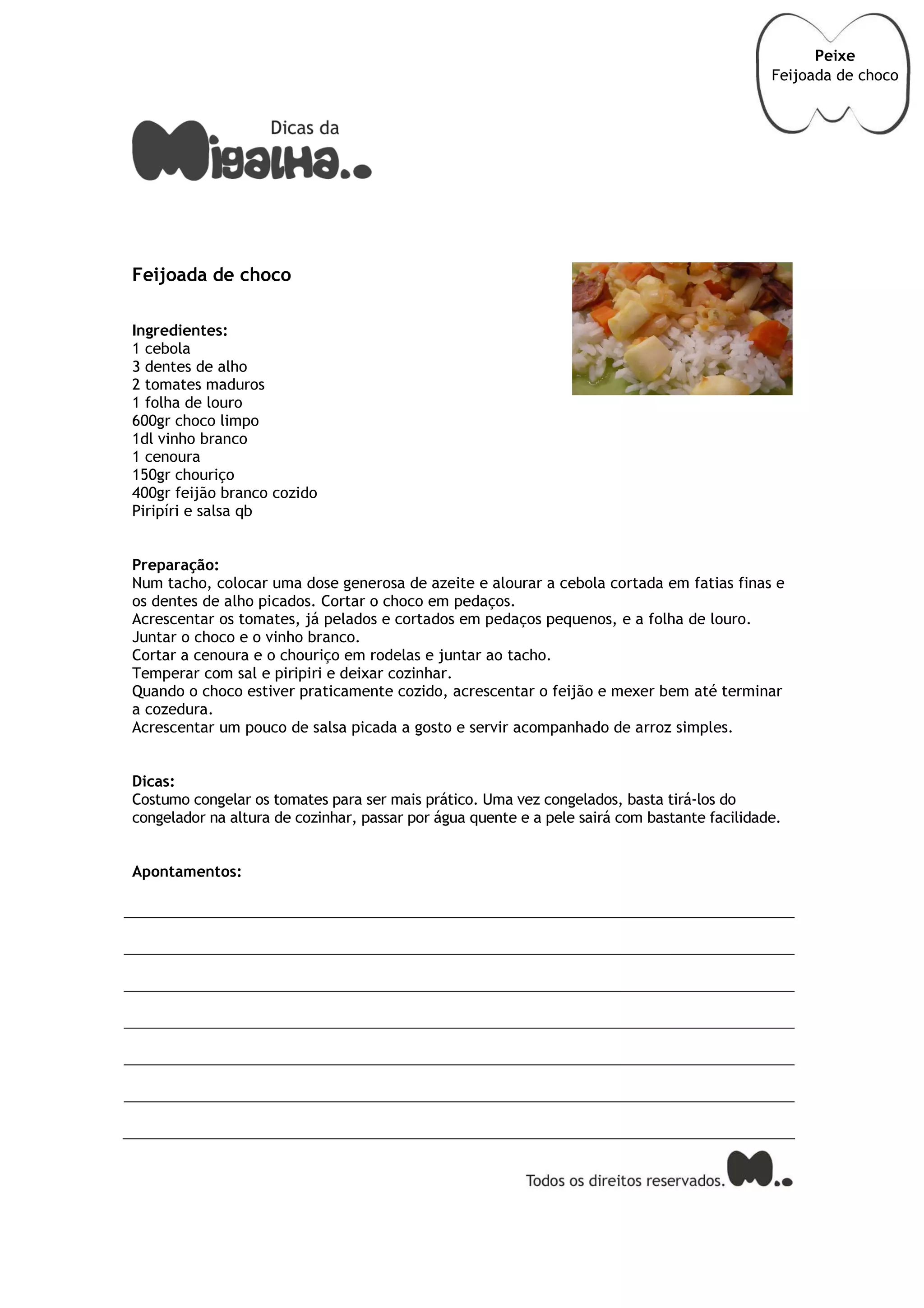Esta receita descreve como preparar uma feijoada de choco, incluindo cortar cebola, alho e tomates e cozinhar com choco, cenoura, chouriço, vinho branco e feijão branco cozido até ficar pronto para servir com arroz. Dá dicas de congelar os tomates para facilitar o preparo e aponta que a pele sairá fácil após descongelar os tomates em água quente.