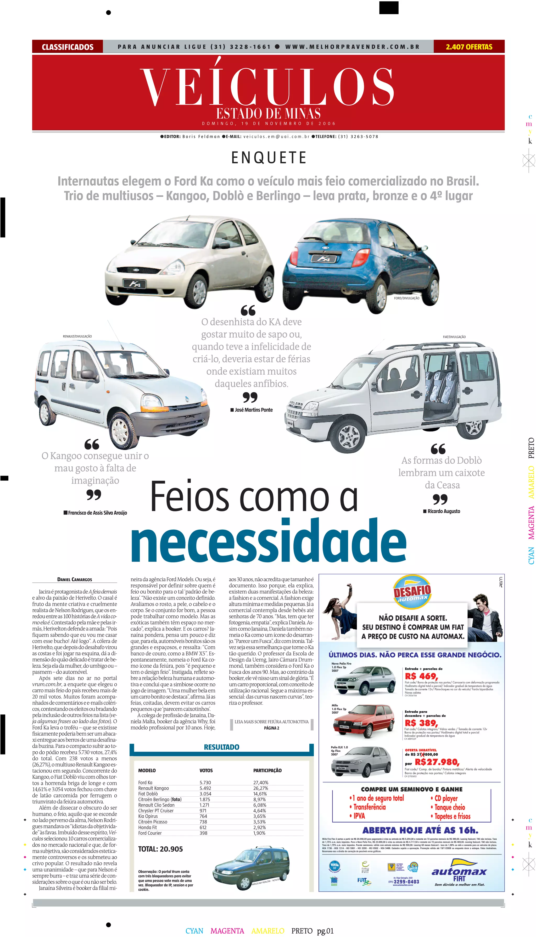 O documento relata uma enquete online que elegeu o Ford Ka como o carro mais feio comercializado no Brasil. O Renault Kangoo ficou em segundo lugar e o Fiat Doblò em terceiro. Especialistas em design e modelos discutem as qualidades estéticas desses veículos e a relação entre a beleza humana e a de automóveis.
