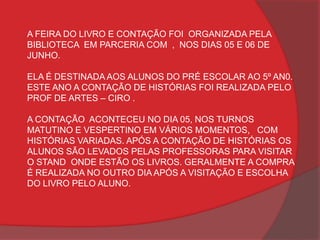 A biblioteca da escola municipal organizou uma feira do livro e contação de histórias nos dias 5 e 6 de junho para alunos do pré-escolar ao 5o ano. O professor de artes realizou a contação de histórias no dia 5 nos turnos matutino e vespertino, após o que os alunos visitaram os livros em exposição. Geralmente as compras são feitas no dia seguinte à visitação.