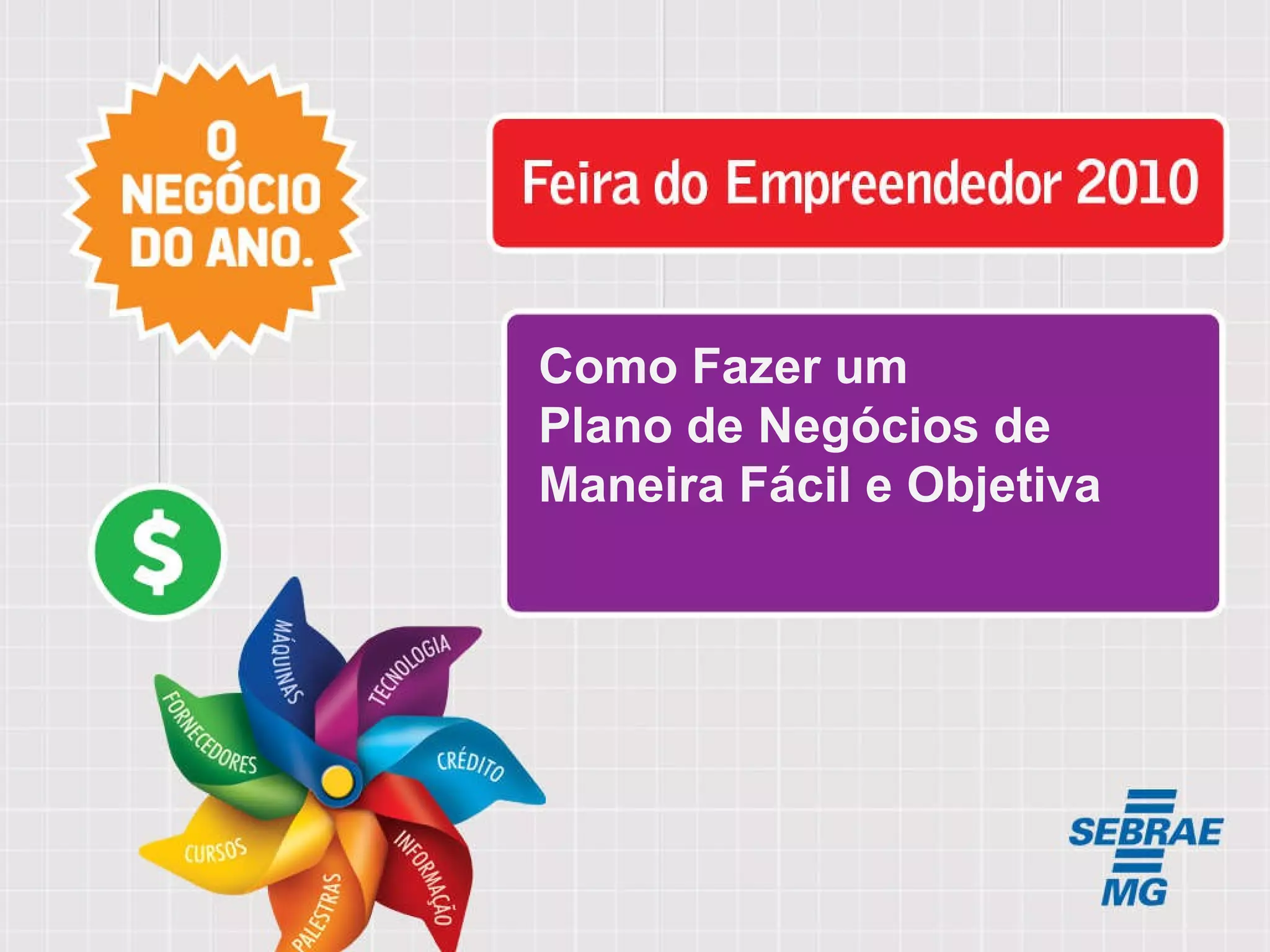 O documento discute como criar um plano de negócios de forma fácil e objetiva. Ele aborda tópicos como estruturar a ideia, responder perguntas importantes, desafios comuns, um caso de estudo de um padeiro, características de um empreendedor, planejamento, gestão e problemas pessoais que podem afetar um negócio. Ele também discute como os negócios surgem de necessidades ou oportunidades e faz 8 perguntas importantes antes de iniciar um empreendimento.