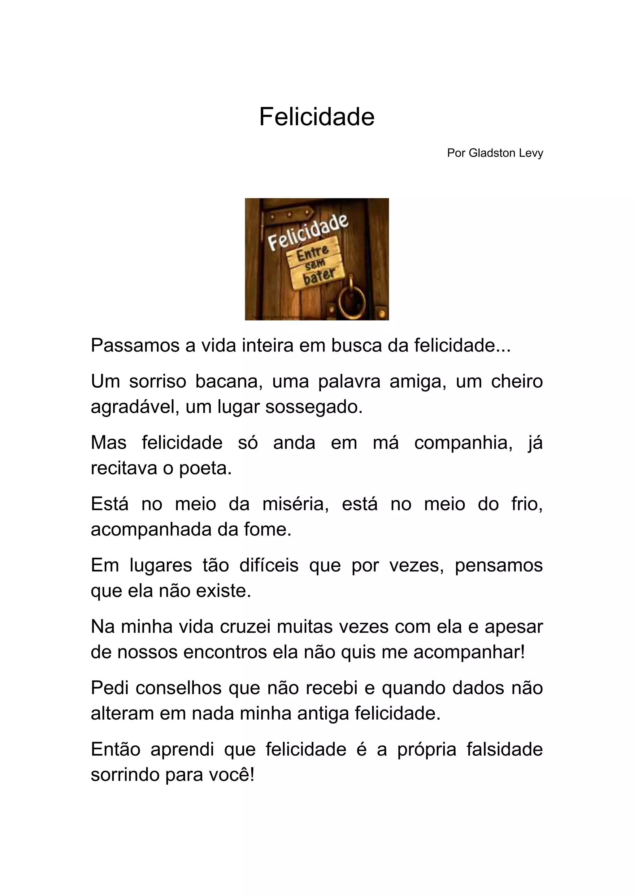 O documento discute a busca pela felicidade e como ela pode ser encontrada em lugares de miséria e dificuldade. Também aborda sobre dívidas entre países e como acordos podem não ser benéficos, e a importância da fé em Deus.