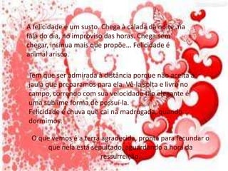 O texto descreve a felicidade como algo esquivo e imprevisível que chega sem aviso. A felicidade verdadeira está nas pequenas coisas do dia a dia, como um sorriso, uma conversa agradável ou um olhar amigo, em vez de ser algo forçado ou controlado. Devemos apreciar a felicidade quando ela aparece, em vez de tentar prendê-la.