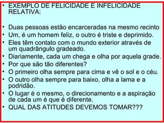 O documento discute a felicidade e infelicidade relativas na Terra, afirmando que a felicidade completa não é possível, mas que cabe a cada um suavizar seus próprios males e ser o mais feliz possível através de sua atitude. A prática da lei de Deus trará felicidade na medida permitida pela existência material. Além disso, o documento enfatiza a importância de espalhar alegria para os outros e de ter poucas necessidades.