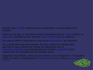 Uma inequação é uma sentença matemática expressa por uma desigualdade, diferente de uma equação que representa uma igualdade. Existem métodos para resolver inequações, como estudar separadamente as raízes e definir intervalos satisfatórios, ou usar um método geométrico envolvendo hipérboles. Uma equação é uma sentença expressa por uma igualdade envolvendo expressões matemáticas e propõe um problema sobre sua validade.