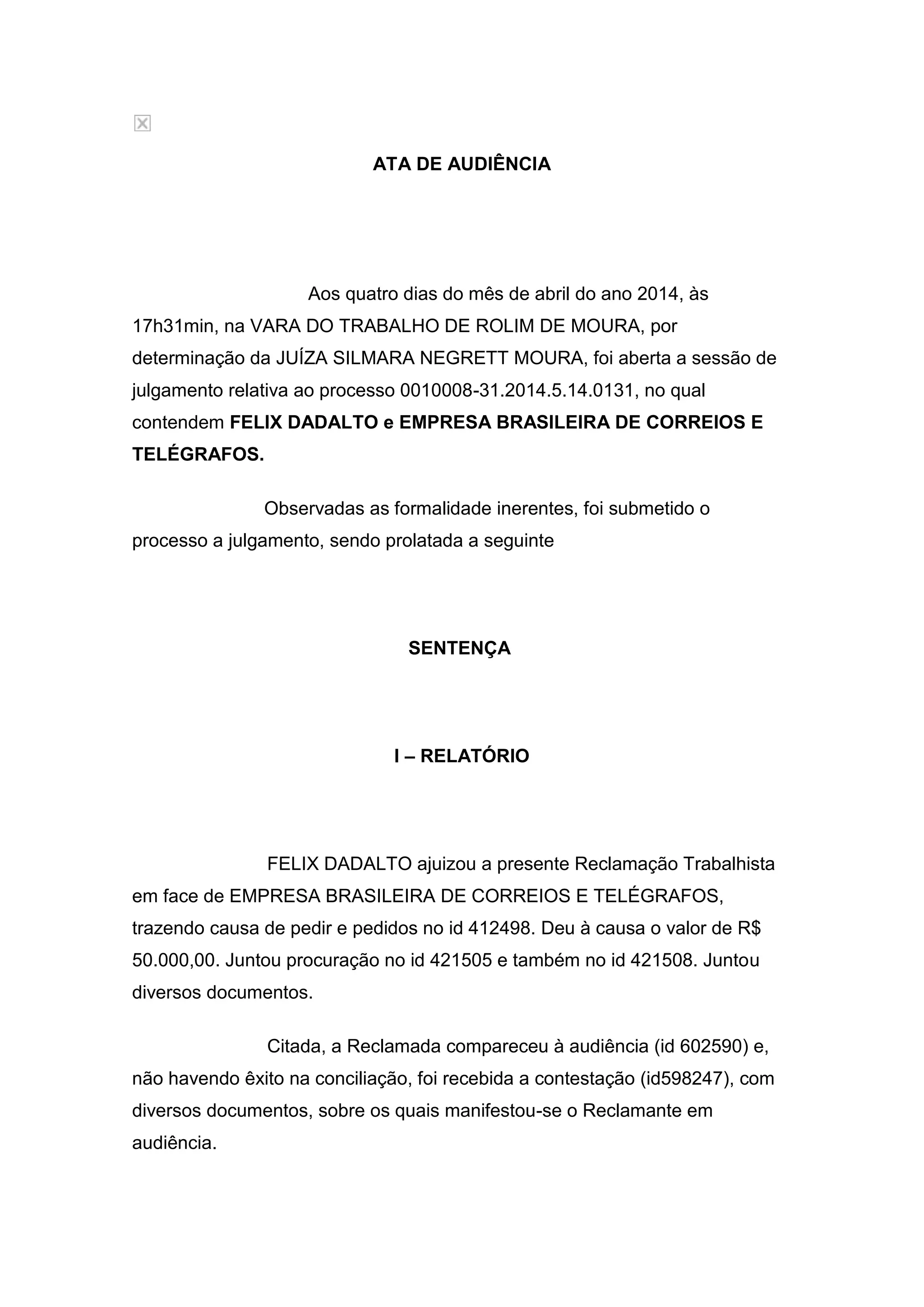 O documento é uma sentença trabalhista que julga um processo entre Félix Dadalto e a Empresa Brasileira de Correios e Telégrafos. A sentença rejeita a alegação da ré de ilegitimidade passiva e condena a Empresa Brasileira de Correios e Telégrafos a pagar indenização por danos morais após assalto em uma de suas agências, por não ter adotado medidas de segurança adequadas.