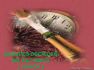 O documento lista as resoluções de ano novo de Junior para cada mês, focando em deixar para trás lembranças ruins, se renovar, ouvir a sabedoria e verdade, abrir-se para o bem, equilíbrio e mutação positiva, ajudar o planeta, fé em Deus, conduzir a vida pelo amor, libertar-se do medo e mágoas, e dar e receber o bem.