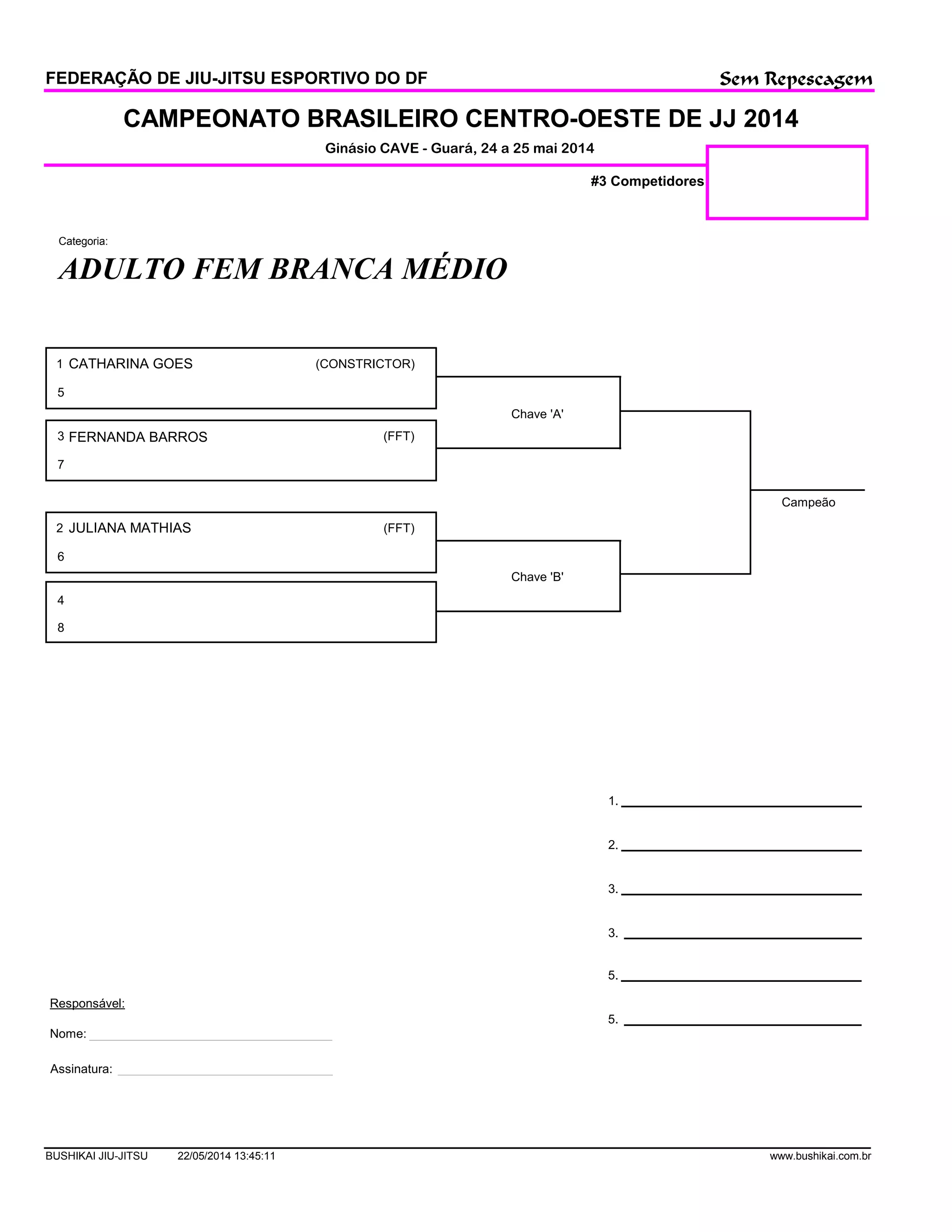 O documento descreve o campeonato brasileiro centro-oeste de jiu-jitsu de 2014, realizado em Guará nos dias 24 e 25 de maio. A categoria em questão era adulto feminino branca médio, com 3 competidoras sem repescagem. A campeã foi Catharina Goes do Constrictor, enquanto Fernanda Barros e Juliana Mathias ficaram em segundo e terceiro lugar, respectivamente.
