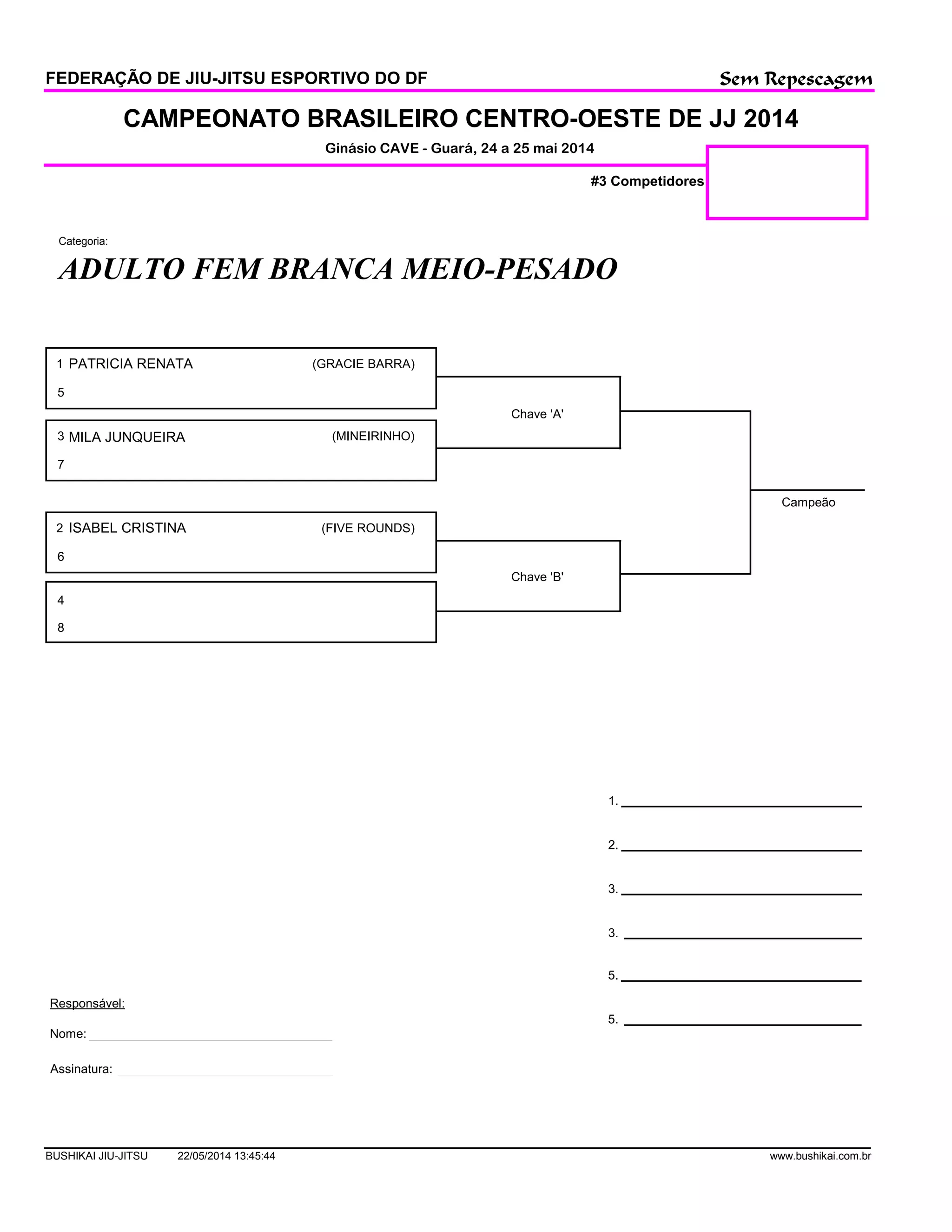 O documento descreve um campeonato de jiu-jitsu brasileiro realizado em Guará entre 24 e 25 de maio de 2014, com 3 competidores na categoria feminina meio-pesado branca. Patricia Renata da Gracie Barra foi a campeã ao derrotar Mila Junqueira do Mineirinho e Isabel Cristina da Five Rounds.