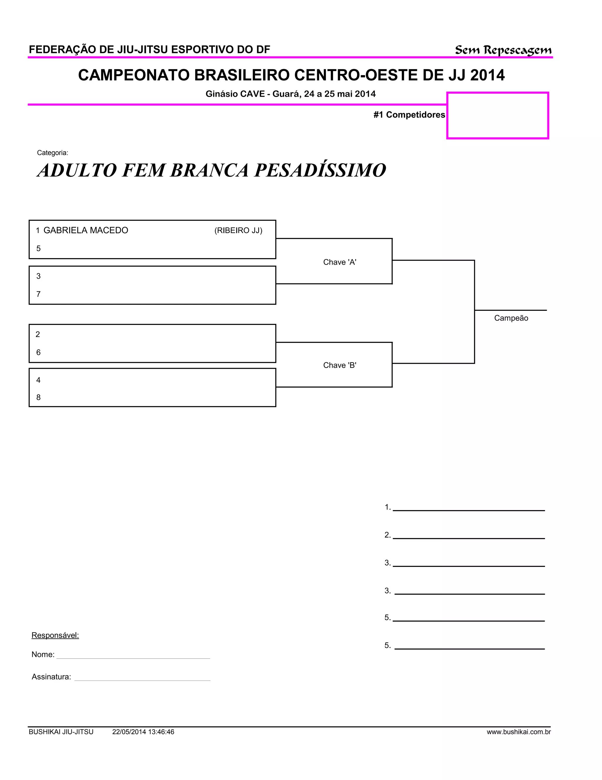 O documento descreve o campeonato brasileiro centro-oeste de jiu-jitsu de 2014, realizado nos dias 24 e 25 de maio no ginásio CAVE em Guará. A categoria específica é adulto feminino branca pesadíssimo, com 8 competidoras divididas em duas chaves sem repescagem, tendo Gabriela Macedo da equipe Ribeiro JJ como campeã.