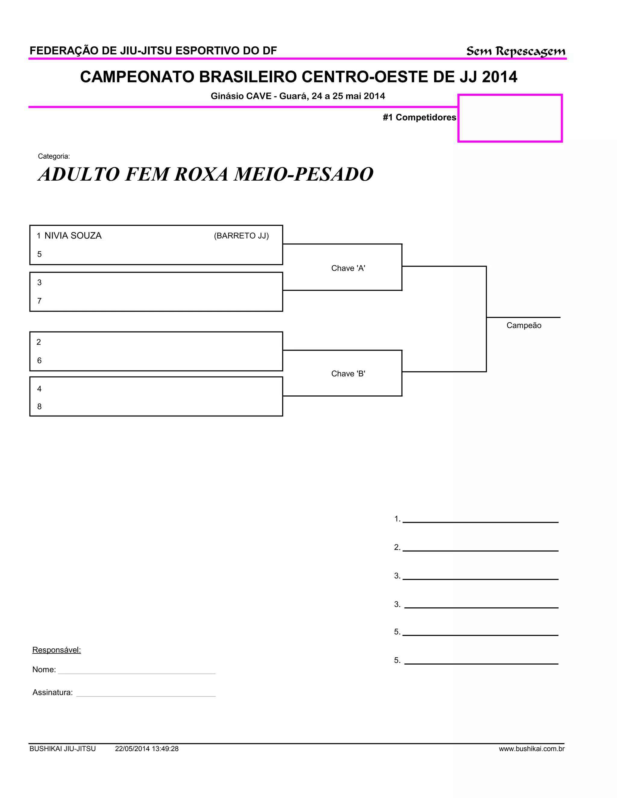 O documento descreve um campeonato de jiu-jitsu realizado em Guará em maio de 2014, com categorias femininas roxa meio-pesado. A competidora Nívia Souza do time Barreto JJ foi a campeã sem precisar disputar a repescagem. O responsável pelo campeonato assinou o documento.