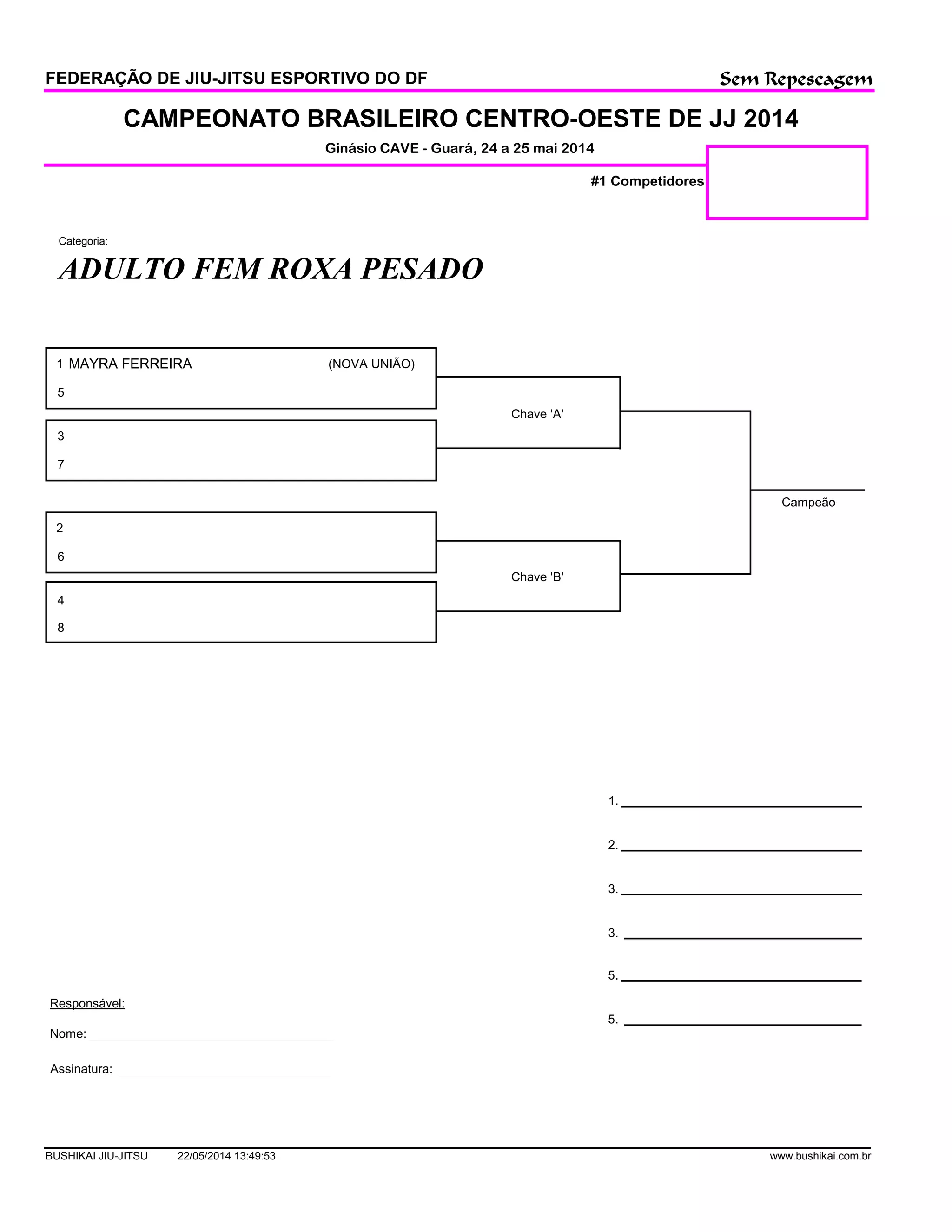 O documento descreve um campeonato de jiu-jitsu realizado em Guará em maio de 2014, com competições na categoria adulto feminino roxo pesado. A competidora Mayra Ferreira da equipe Nova União foi a campeã sem precisar passar por repescagem, derrotando as oponentes nas chaves A e B.