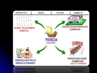 Os fenícios habitavam uma estreita faixa de terra entre o mar Mediterrâneo e as montanhas do Líbano. Devido à pobreza do solo, desenvolveram o comércio marítimo, pesca e artesanato. Organizavam-se politicamente em cidades-estados como Tiro, Sídon e Biblos. Criaram o primeiro alfabeto que influenciou muitas outras culturas.