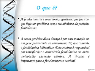 O documento descreve o que é fenilcetonúria (PKU), como ela ocorre geneticamente, seus sintomas e formas de tratamento. A PKU é uma doença genética que causa problemas no metabolismo da proteína fenilalanina, levando a atrasos no desenvolvimento se não tratada através de uma dieta pobre em proteínas e suplementada. O tratamento envolve manter os níveis de fenilalanina baixos através de uma alimentação específica para a vida toda.