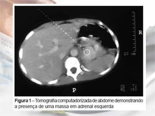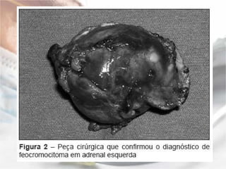1) O feocromocitoma é um tumor raro derivado das células cromafins que produz excesso de catecolaminas, podendo causar crises hipertensivas ou hipertensão sustentada.