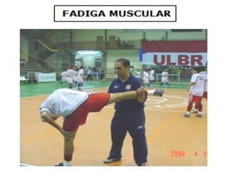O documento descreve a respiração celular anaeróbica, que produz energia na ausência de oxigênio através da glicólise. A glicólise converte glicose em álcool, ácido lático ou ácido acético, produzindo pequena quantidade de ATP. As leveduras e fibras musculares realizam respiração aeróbica e anaeróbica, e a dor muscular após exercício é causada pelo acúmulo de ácido lático.