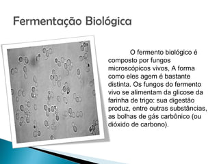 O documento descreve os processos de fermentação biológica e láctea. A fermentação biológica envolve fungos que se alimentam da farinha e produzem bolhas de gás carbônico, enquanto a fermentação láctea usa bactérias probióticas que promovem benefícios à saúde e são usadas em iogurtes, queijos e outros produtos.