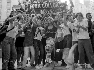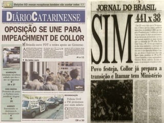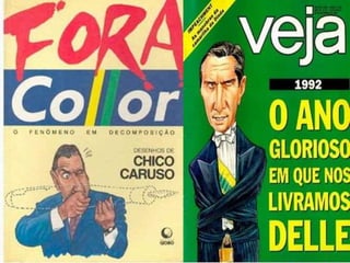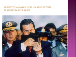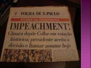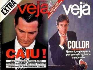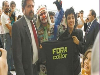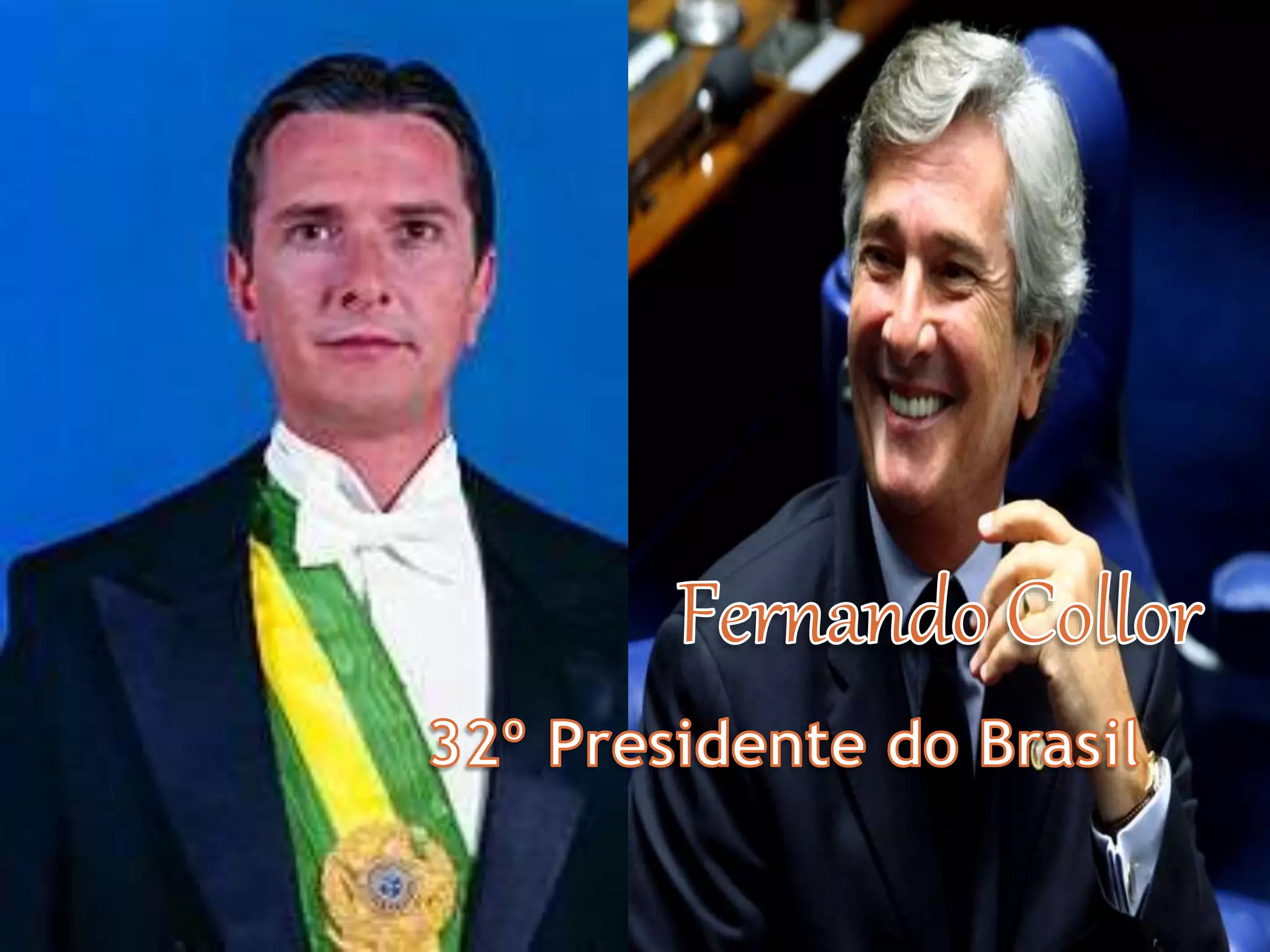 Fernando Collor de Mello, ex-presidente do Brasil (1990-1992) e político, implementou medidas econômicas drásticas durante sua gestão, sendo o responsável pela introdução do neoliberalismo no país, mas enfrentou escândalos de corrupção que levaram ao seu impeachment. Itamar Franco assumiu a presidência após o impeachment de Collor, lançando o Plano Real em 1994, que estabilizou a economia e controlou a inflação. Franco também teve uma carreira política significativa, incluindo sua atuação como embaixador após deixar a presidência.