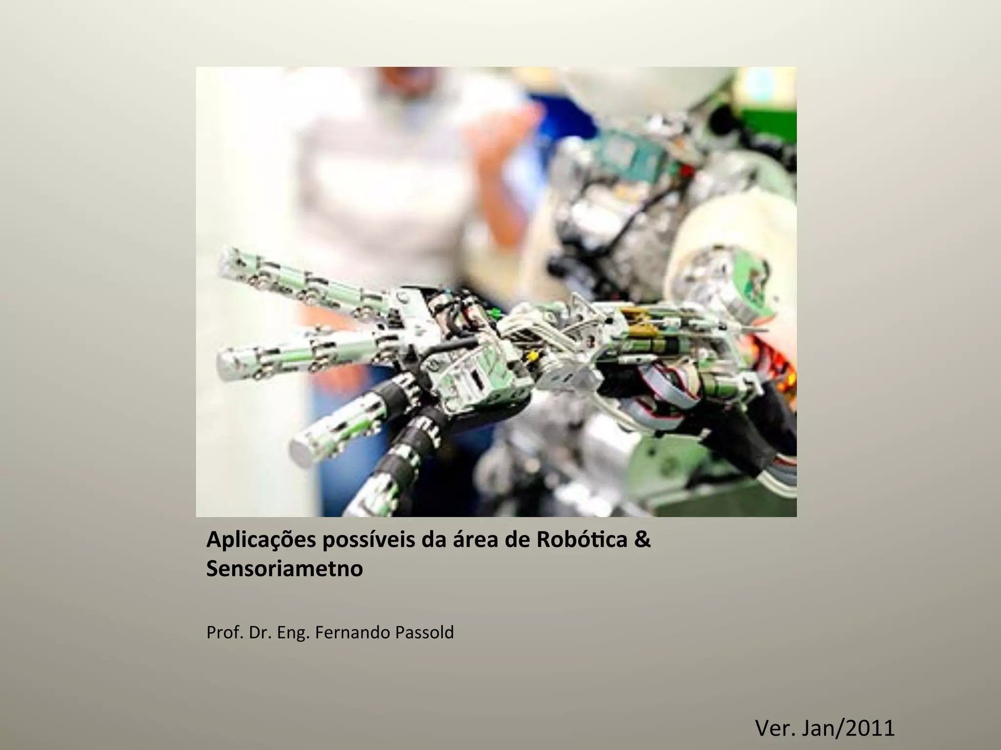 O documento aborda diversas aplicações da robótica e sensoriamento, destacando o uso de robôs em controle automatizado de estoque, coleta remota de amostras, manutenção preventiva, e automação portuária, além de mencionar a agricultura de precisão e sensoriamento remoto. Também discute robôs móveis autônomos e colônias de robôs que cooperam para realizar tarefas. O autor, Prof. Dr. Eng. Fernando Passold, é especialista em robótica com experiência em engenharia elétrica e importantes contribuições em controle e otimização.